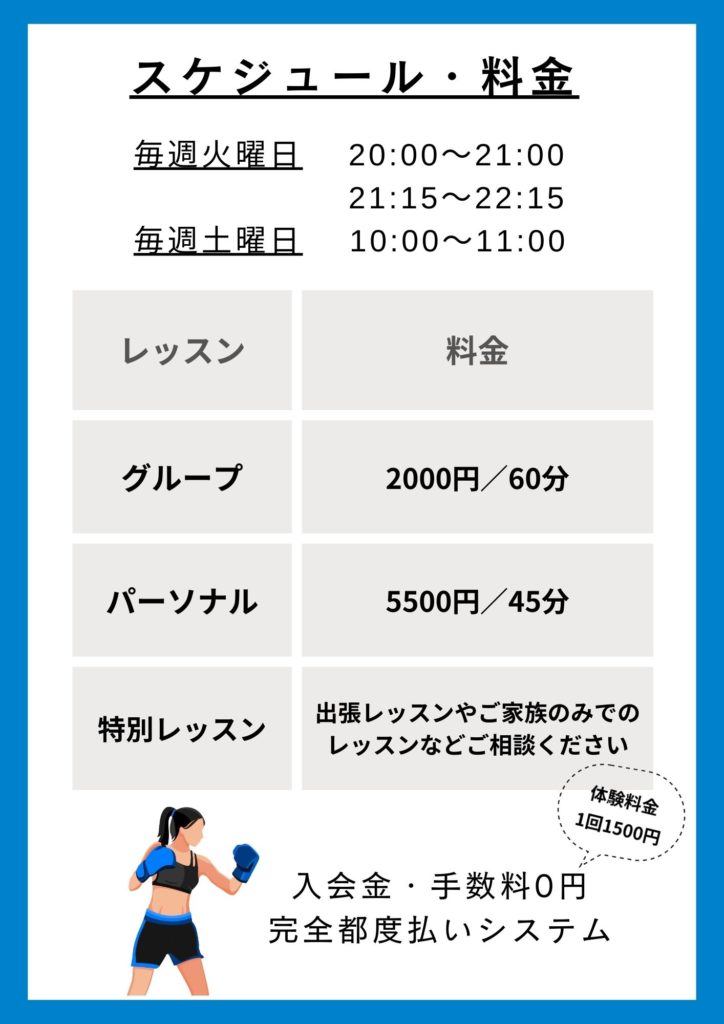 初期費用 入会金0円手数料0円 都度払い料金(1回) 通常レッスン(60分)2000円パーソナルレッスン(45分)5500円出張レッスン(人数、場所、時間要相談)2500円 〜 | | 問い合わせ&体験予約